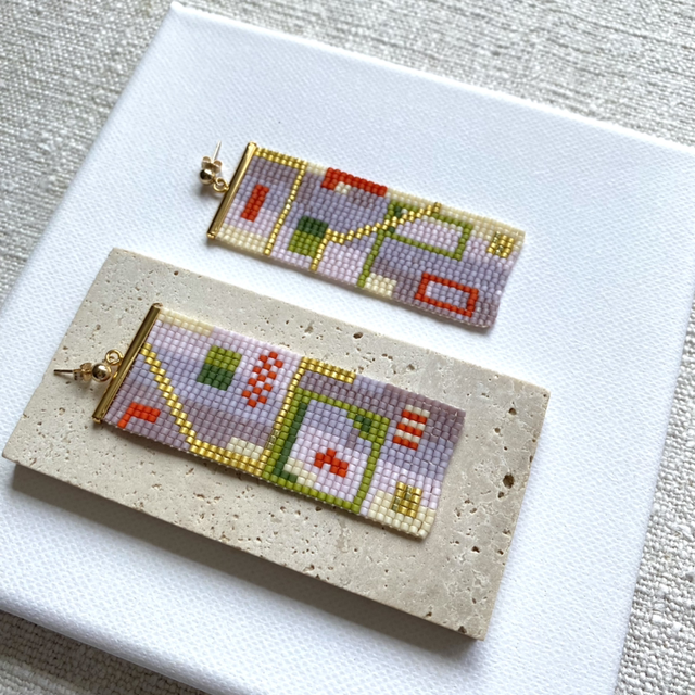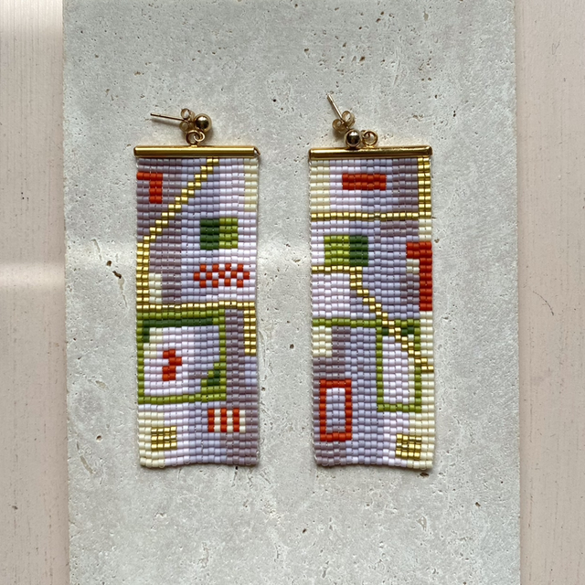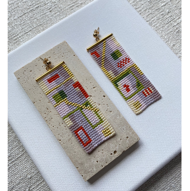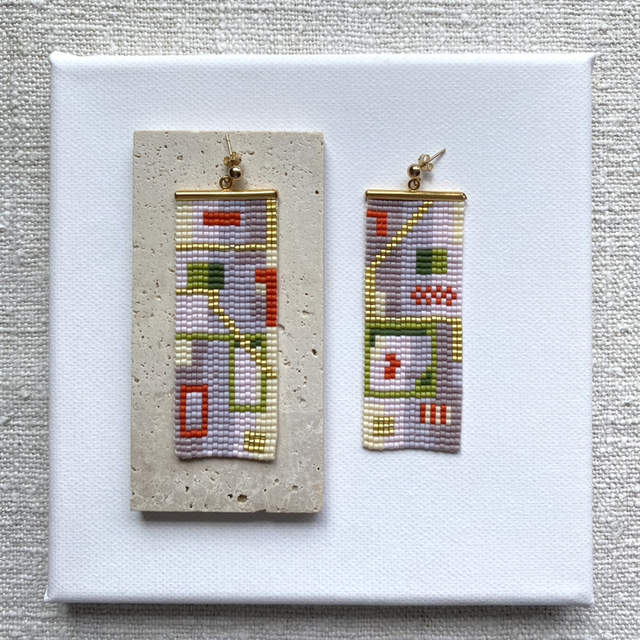One-off handwoven glass bead earring made of delicate Japanese glass beads and gold pleated and gold filled findings.
